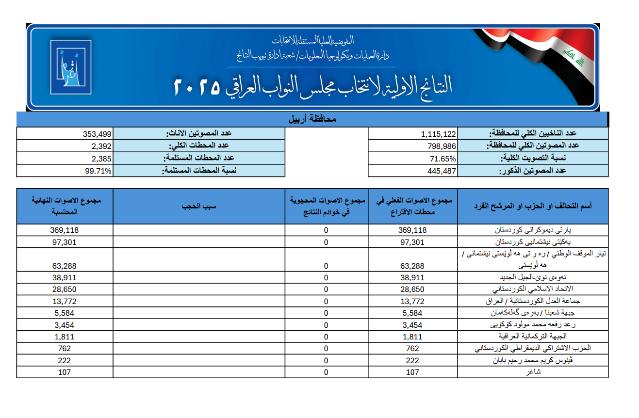 کۆمیسیۆن ئەنجامی بەرایی هەڵبژاردنی گشتیی دەنگدانی بۆ پەرلەمانی عێراق بڵاو کردەوە و پارتی بەجیاوازییەکی زۆر و بە بەدەستهێنانی 369 هەزار دەنگ یەکەمە و دوای ئەویش یەکێتی دێت بە بەدەستهێهنانی 97 هەزار دەنگ.